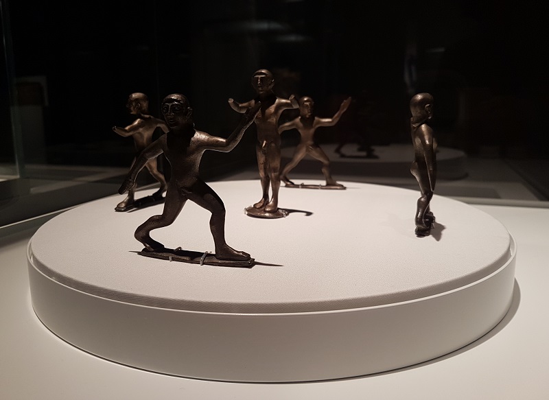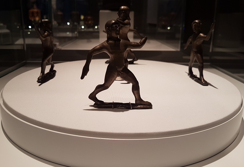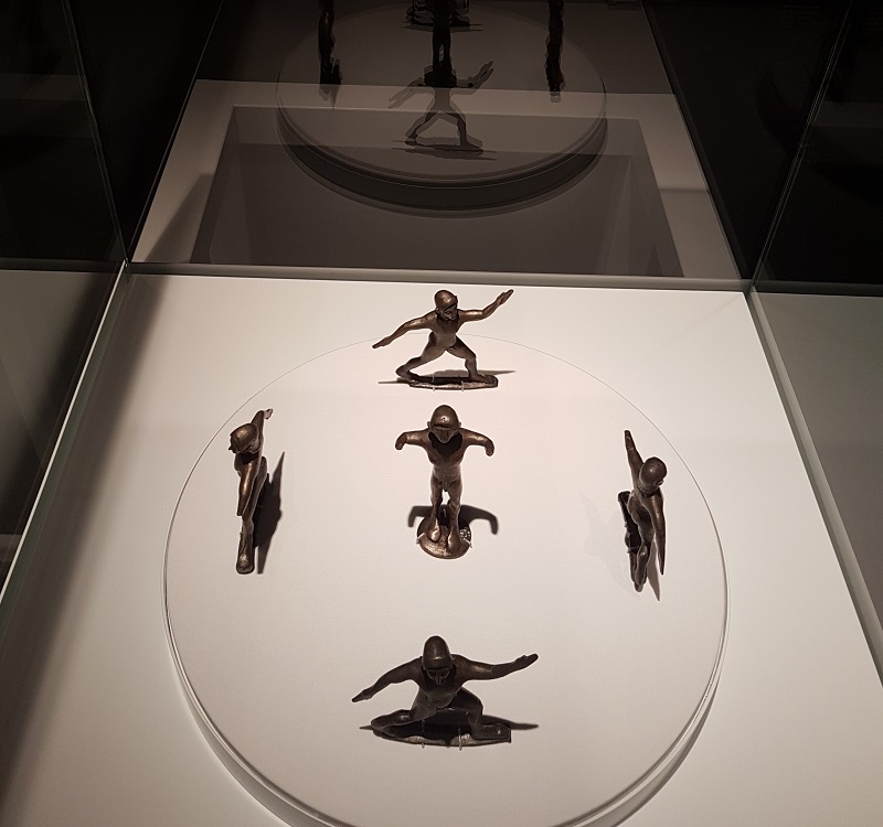 De la sección competiciones deportivas, destacamos unas figuritas de velocistas en bronce etrusco-campanienses realizadas en 480 a.C. Representan a cuatro jóvenes desnudos, con un brazo flexionado hacia delante y el otro hacia atrás para denotar movimiento y velocidad, están en pleno sprint. Probablemente forman parte del trofeo de alguna competición.