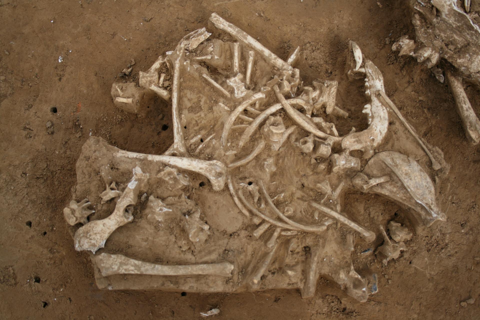 Además de los restos articulados inhumados, se encontraron 899 fragmentos óseos de unos 15 individuos en algunas de las fosas y zanjas del yacimiento. Habían sido triturados deliberadamente. Se han encontrado pruebas de golpes y cortes en algunos de los fragmentos, incluso en los cráneos que pueden haber quedado cuando la gente quitaba la cara del difunto para hacerse una máscara con ella. Los fragmentos óseos datan de entre principios del siglo II y finales del siglo I a.C.
