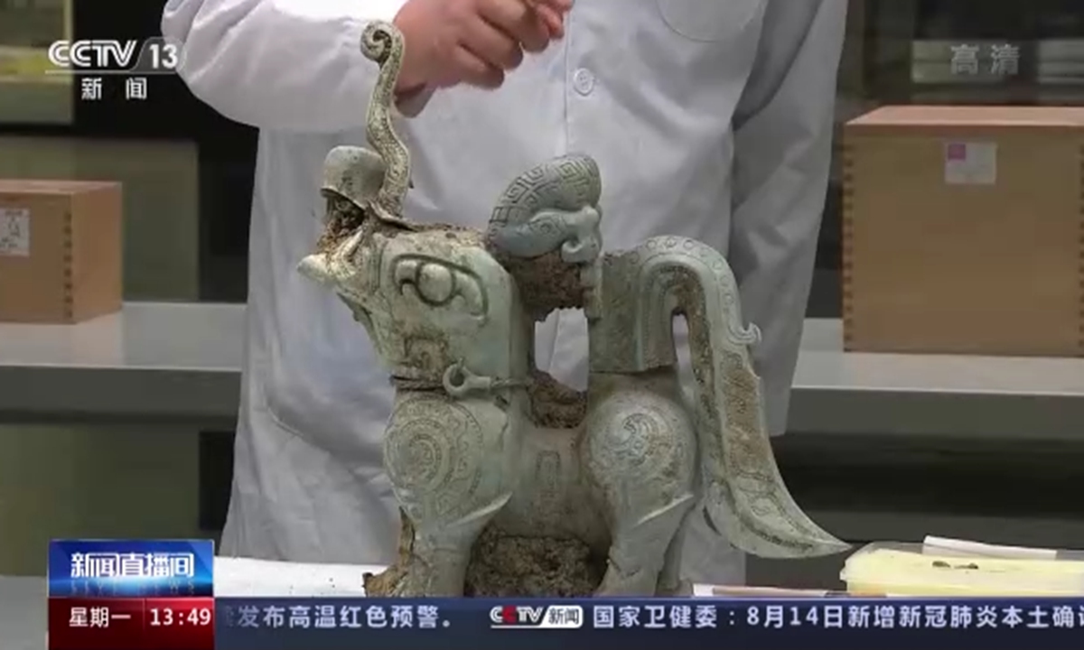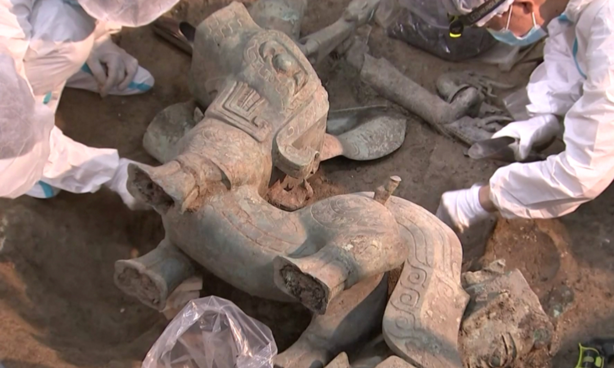 No sólo es el mayor bronce zoomorfo desenterrado en Sanxingdui, sino también el más completo. Sólo uno de los brazos de la figura y una de las orejas de la criatura están rotos. Las seis fosas de Sanxingdui estaban repletas de miles de objetos de bronce, oro, jade y marfil que el pueblo Shu rompía y quemaba ritualmente antes de enterrarlos hace unos 3.100 años. De los aproximadamente 13.000 objetos recuperados en las fosas desde que se iniciaron las excavaciones en 2020, menos de 2.500 se encontraron intactos.
