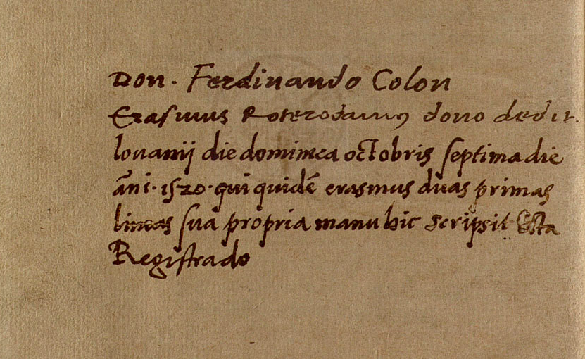Hernando Colón nació en Córdoba en 1488. Bibliófilo y bibliógrafo, porque no sólo sentía obsesión por poseer y coleccionar libros de ediciones extrañas y preciadas, sino que los conocía, catalogaba, estudiaba y describía. Es un personaje llamativo y desconocido, acompañante e historiador de su padre en el 4º viaje a América, cosmógrafo y varón de su tiempo.