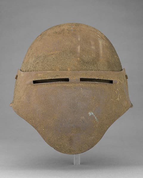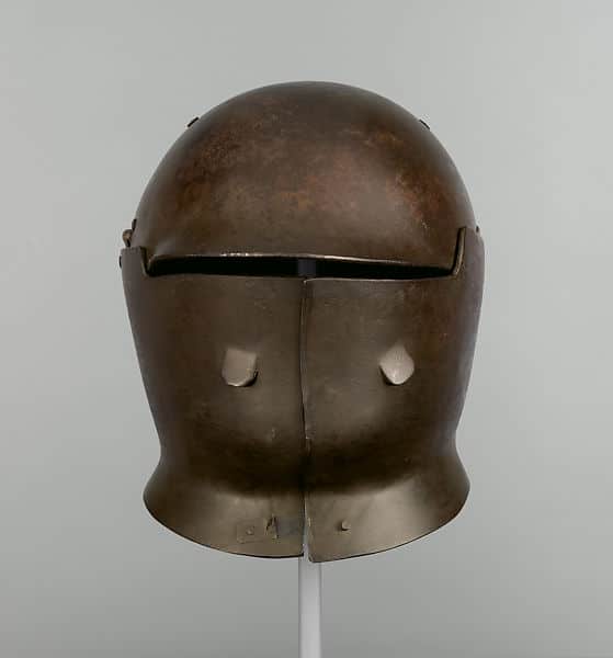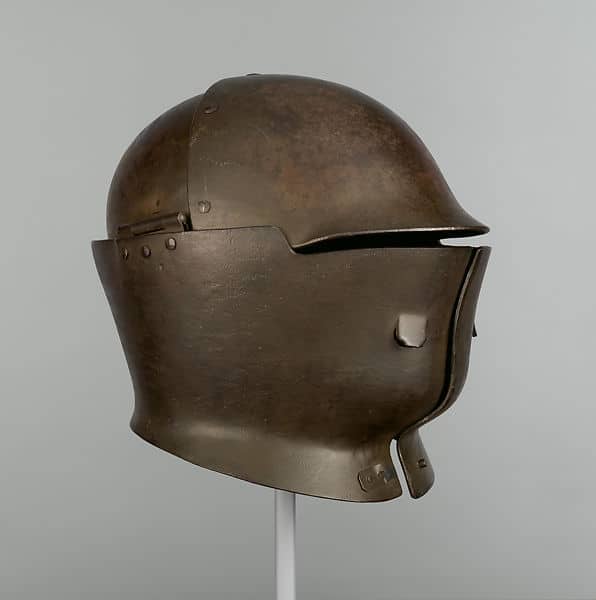 Tiene una visera (elevable) para proporcionar la máxima protección al rostro y al mismo tiempo permitir una buena visibilidad, el interior está acolchado con cuero y lana. Su construcción se basó directamente en un tipo de casco italiano muy popular en el siglo XV.