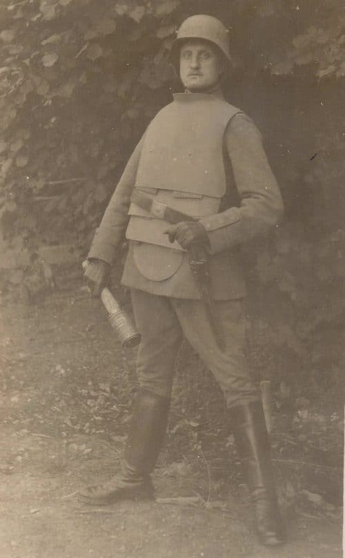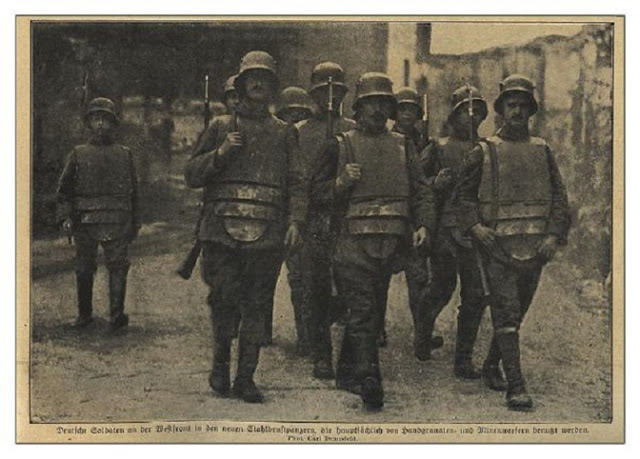 Los alemanes introdujeron el “Grabenpanzer” (armadura de trinchera) en 1916. Era un peto hecho de acero blindado conectado en la parte inferior con placas posteriores como una cola de langosta. Era una construcción pesada, con un peso entre 9 kg y 15 kg.