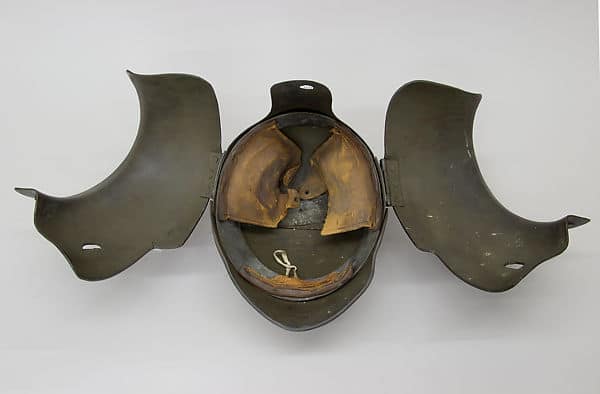 Este casco fue diseñado por el Dr. Bashford Dean (fundador del Departamento de Armas y Armadura del Museo Metropolitano de Nueva York) entre 1917 y 1918 como parte de una serie de prototipos experimentales de protecciones para ser utilizadas durante la Primera Guerra Mundial.