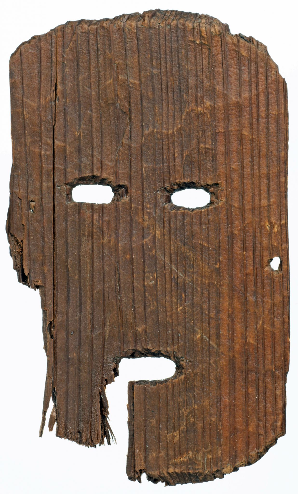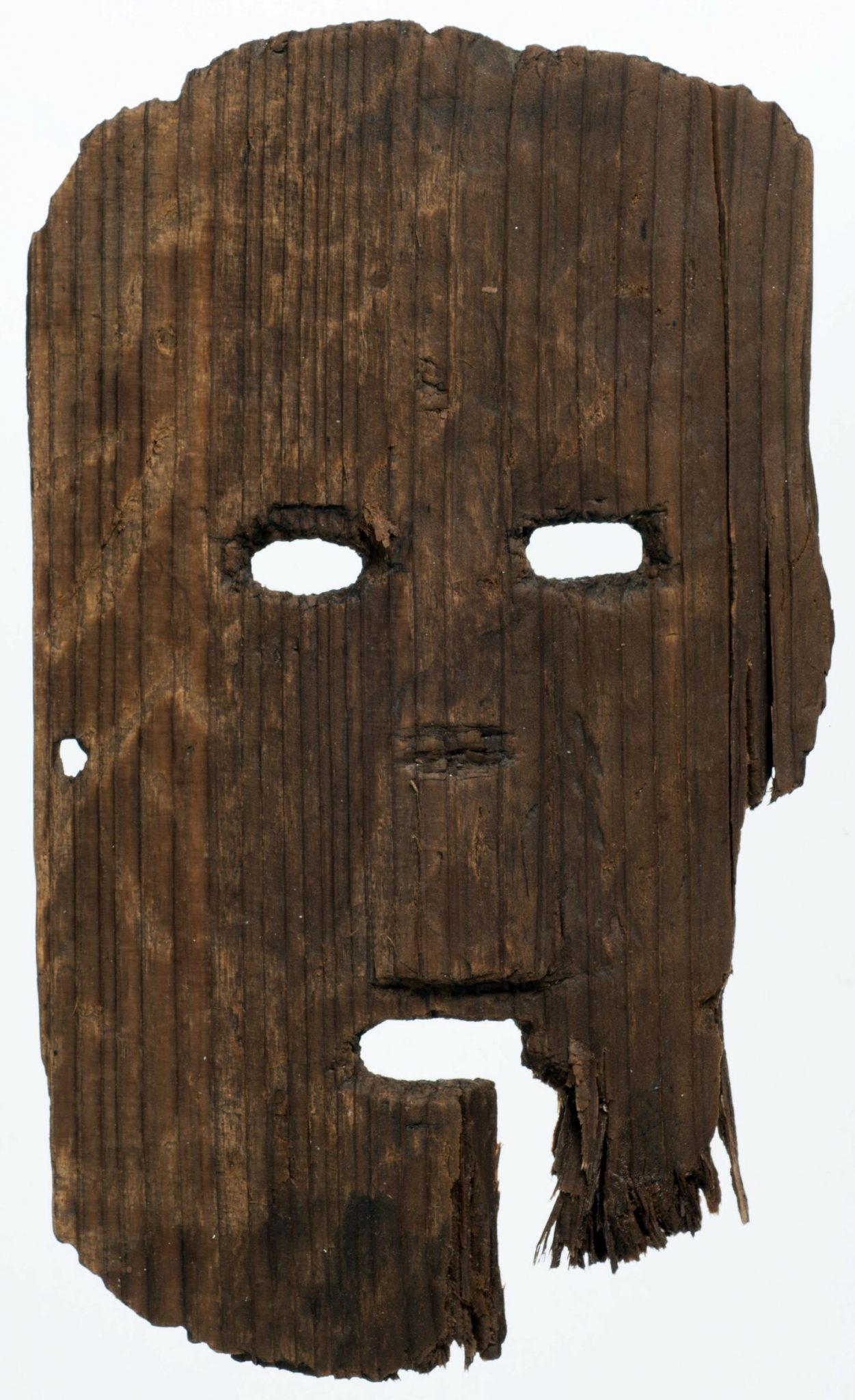 El objeto fue encontrado en una capa de sedimentación causada por una inundación, a una profundidad de unos 3 metros bajo la superficie. Gracias a las condiciones del terreno, la madera se ha conservado prácticamente en perfecto estado.La pieza en cuestión mide alrededor de 30,48 centímetros de largo, 17,78 centímetros de ancho y 2,03 centímetros en su punto más grueso. La máscara fue tallada en una sola pieza de cedro, con agujeros cortados para los ojos y la boca, así como una proyección en ángulo que conecta la mitad de los ojos con la parte superior de la boca, a modo de nariz. Se cree que la máscara se montaba con una cuerda que se pasaba por un pequeño orificio situado en el lado derecho.