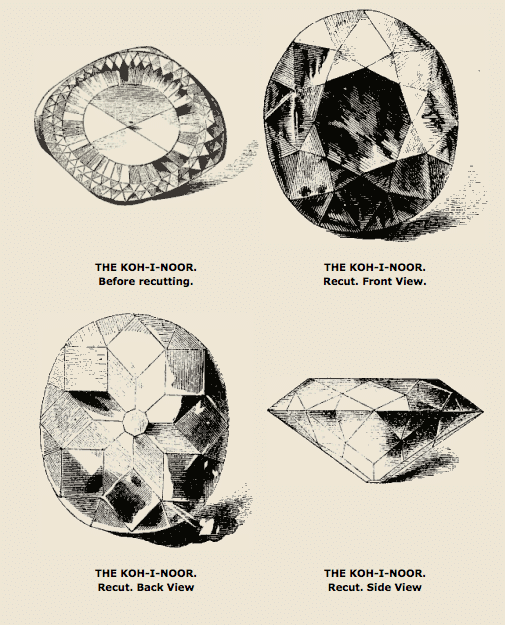 Su nombre, Koh-i-Noor (Kohinoor o Koh-i-Nur) significa “Montaña de Luz”, pesaba 186 quilates y tenía un irregular corte ovalado que lo hacía el diamante más alargado conocido.