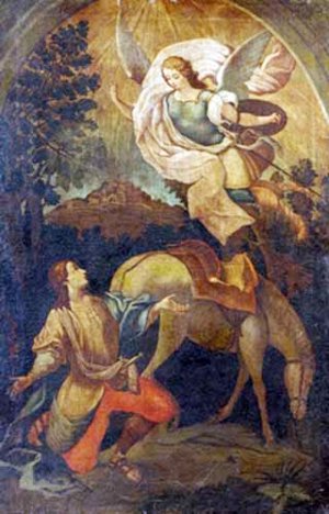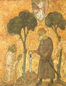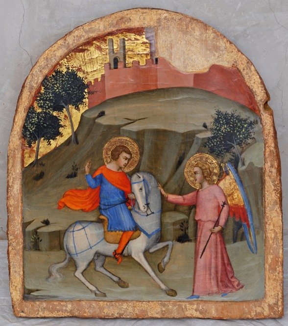 Cuenta la leyenda que el arcángel San Miguel se le apareció en varias ocasiones. Tras el primer encuentro, Galgano, abandonó su vida despreocupada y comenzó a predicar por los alrededores de Siena, abandonando sus ricas ropas por un hábito. Mucha gente trató de impedírselo, su familia, sus amantes, su prometida… Nadie entendía que le había pasado.