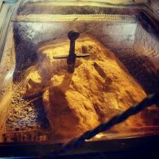 Hasta 1924 la espada estaba suelta y se podía extraer, pero por miedo a que fuera robada se vertió plomo fundido en la ranura para dejarla fijada. En 1992 un hombre, que se debía creer el rey Arturo, trató de extraerla rompiéndola, dañando la empuñadura y la hoja. De ahí que a día de hoy se conserve bajo una cúpula plástica.