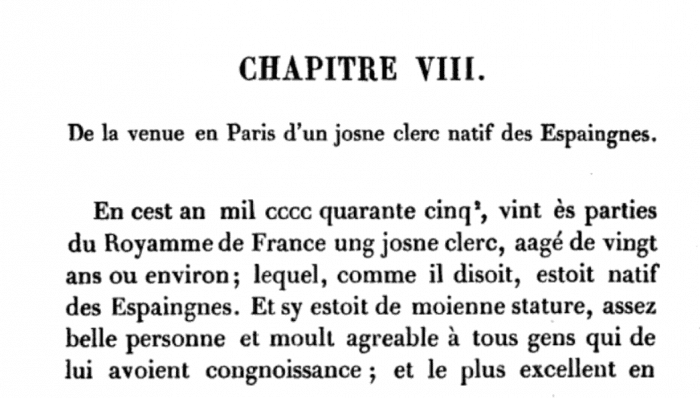 Las cartas de Juan de Oliva eran muy poco conocidas, pero sí lo era el “Diario escrito por un ciudadano de Paris” atribuído al mismo maestro, y en él también se da cuenta de la aparición del español, aunque afirma que llegó a París tras la Pascua, año nuevo en Francia por entonces, por lo que lo fecha en 1446.