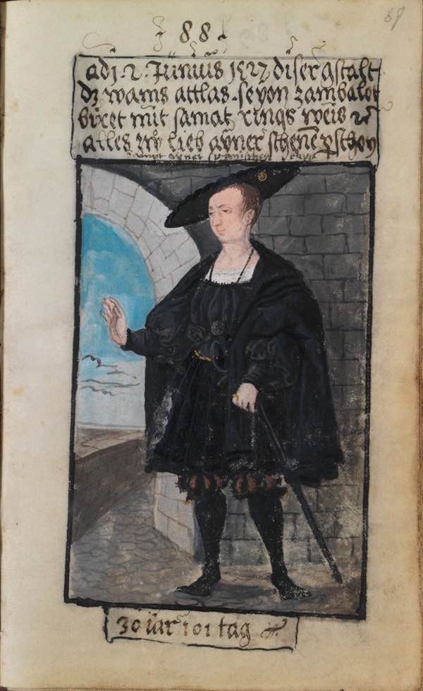 En aquellos días, aún no era posible tomarse un selfie y publicarlo en Instagram, por lo que el proto-fashionista se vio obligada a contratar artistas que dibujasen y grabaran cuidadosamente sus estilismos. 137 de estos bocetos con descripciones detalladas componen la obra “Klaidungsbüchlein” también conocida como Schwarzsche Trachtenbuch (el libro de los trajes de Schwarz), que se considera la primera publicación sobre moda de la historia.