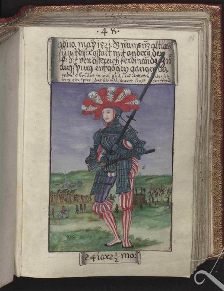 En 1521, nuestro fashionista recibió la noticia de que el Emperador del Sacro Imperio Romano Germánico, Carlos V, cuando iba a visitar Augsburgo. A Schwartz se le ocurrió la idea de vestirse para un evento tan importante con el atuendo de un Lansquenete y adornó el sombrero con exuberantes plumas de avestruz blancas y rojas. Se suele decir que fue la primera vez que se implementaba un atuendo militar como ropa civil, plumas incluidas.