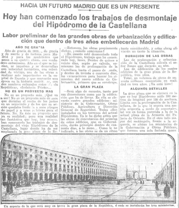 Pero el caso que nos ocupa, no es el de una plaza rebautizada: es el de una plaza “proyectada” , un espacio totalmente nuevo que sería representativo de la II República. En 1933, la prensa de la época anunciaba así la construcción de la “Gran Plaza de la República”: