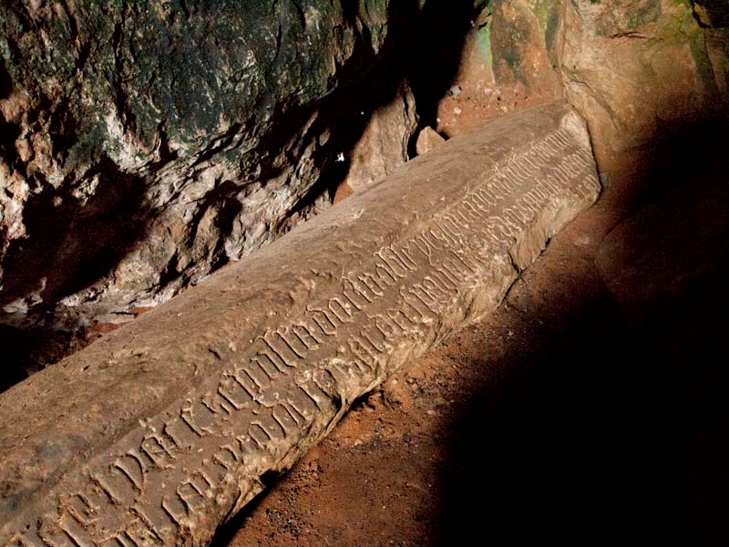 Aquí yace sepultado el noble y esforzado cavallero Bernardo del Carpio defensor de España hijo de don Sancho Diaz conde de Saldaña í dela ínfanta doña Xímena hija del rey don Alonso el II llamadoel Casto. Murió por los años de 850.