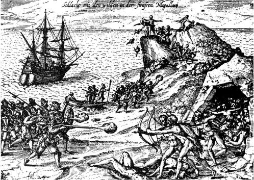 Magallanes, que no podía prescindir de nada de equipo material debido al penoso estado en el que se encuentra su Armada -habían perdido ya dos naos y las cosas con la dotación del San Antonio no estaban para mostrar debilidades-, envía una dotación a tierra para recuperarla. Al llegar a la playa los chamorros los recibieron arrojando lanzas. Las palabras de Magallanes son firmes, “hay que imponer respeto desde el principio”. Los soldados abren fuego con sus trabucos y los isleños huyen despavoridos.