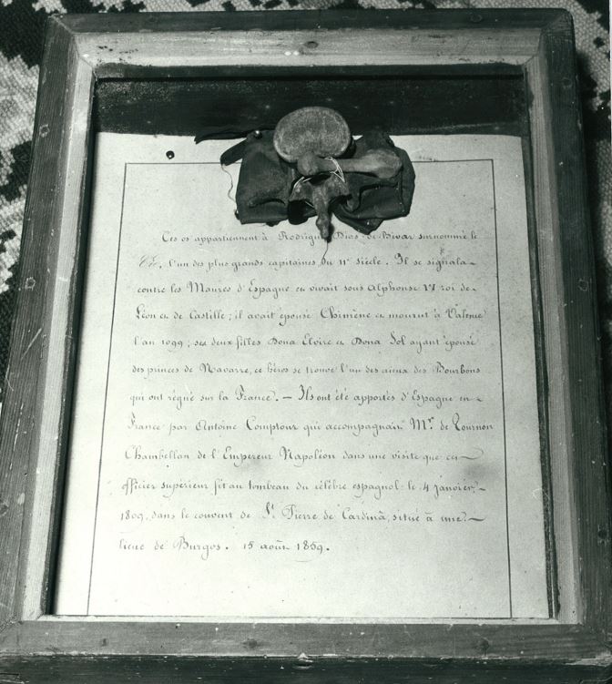 El Cid, había sido enterrado en la catedral de Valencia pero tras el desalojo, organizado por Alfonso VI y Jimena, sus restos fueron llevados al monasterio de San Pedro de Cardeña. Allí reposarían unos cuantos siglos, hasta que durante la ocupación francesa (h1808) fueron profanados. Los franceses, muchas veces por saquear y otra por denigrar a los héroes que, como el Gran Capitán, los habían derrotado en los campos de batalla solían abrir sus tumbas, robar sus tesoros y esparcir sus huesos por la calle.