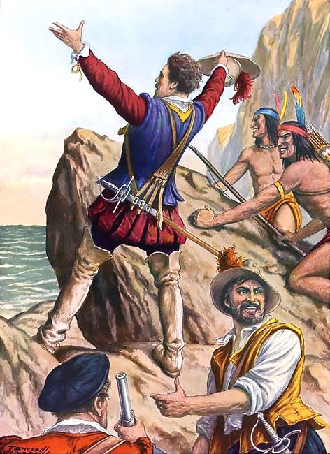 Alzó sus manos, en una estaba su espada y la otra un estandarte, entró al mar hasta las rodillas y tomó posesión del mar en nombre de los soberanos de Castilla.