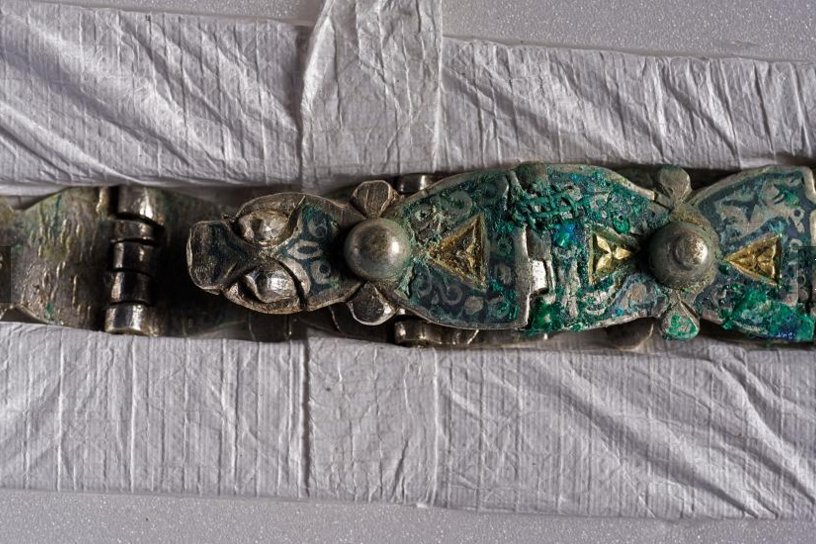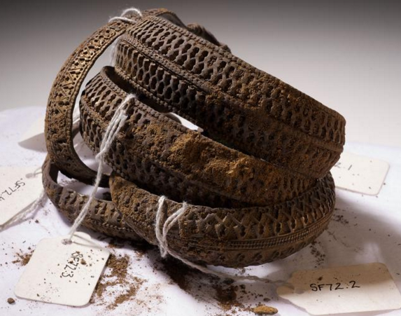 Más de mil piezas, envueltas individualmente en telas y sedas, se han llegado a encontrar en la zona: una cruz, brazaletes, oro, cristal, broches e incluso lingotes de plata y oro, un gran tesoro del que no conocemos más que su procedencia y datación.