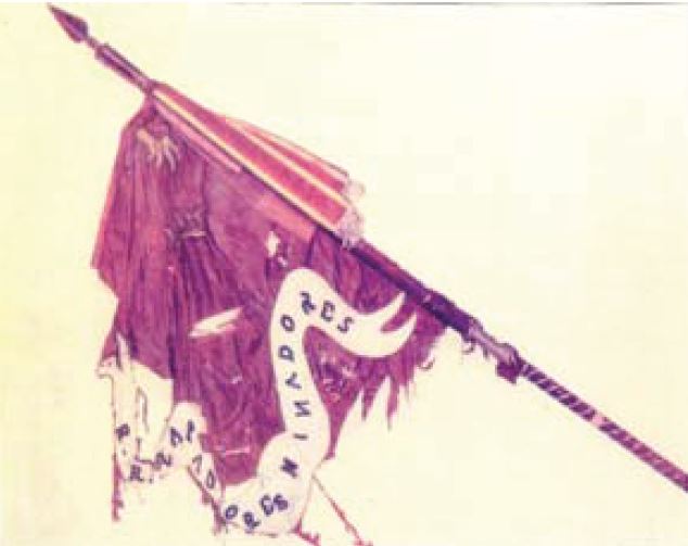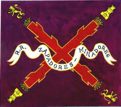 Cada Batallón tendrá una bandera igual en dimensiones a la que tienen los Regimientos de Infantería; la primera bandera será morada con el escudo de mis reales armas y el lema “Real Cuerpo de Zapadores y Minadores”; la segunda ha de ser también morada, con la cruz de Borgoña y el mismo lema, en dos de sus ángulos tendrá un castillo, y en los otros dos un león.