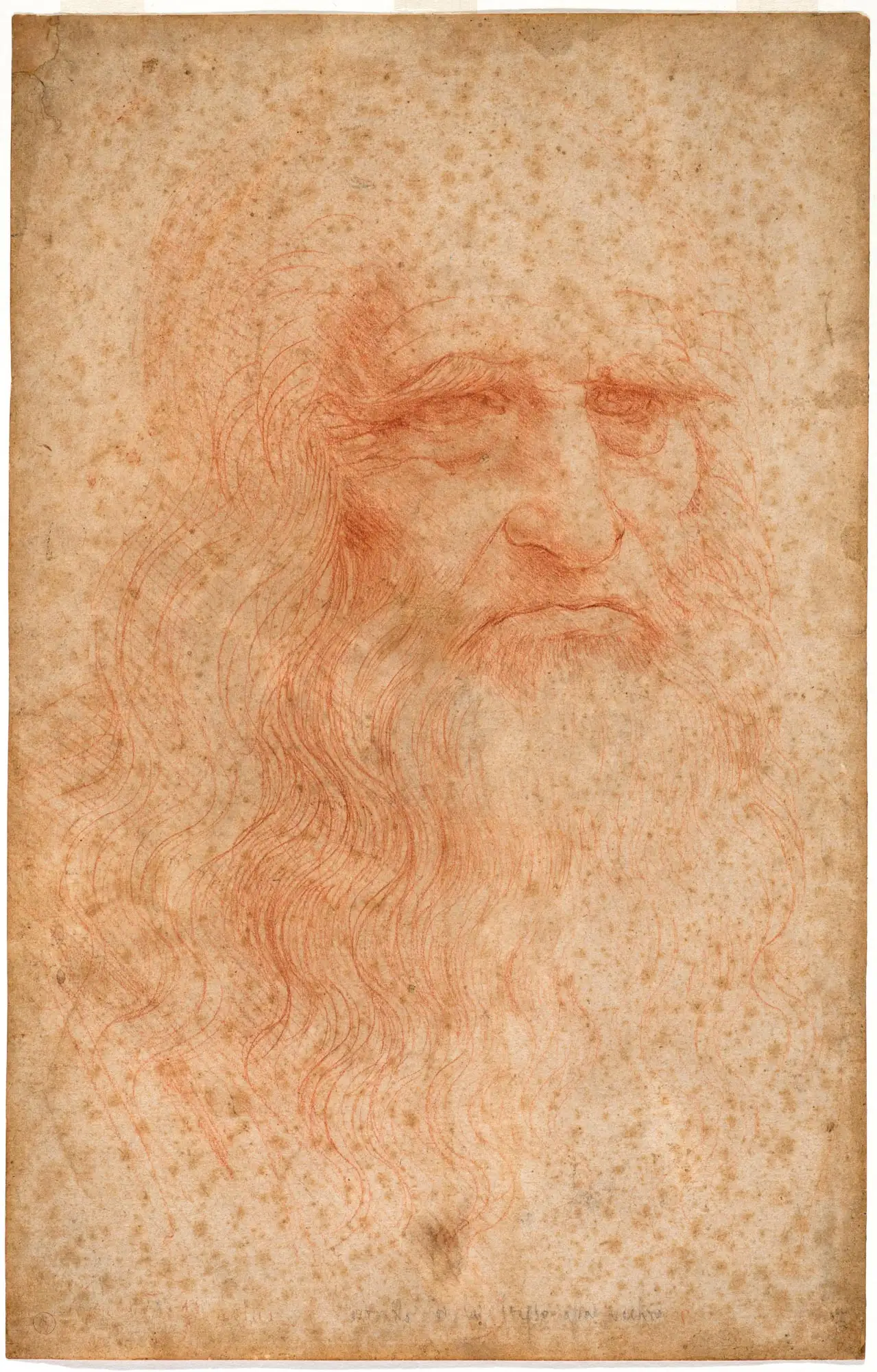 Leonardo da Vinci, Autoritratto (1517-1518 circa; pietra rossa su carta, tracce di pietra nera, 333 x 213 mm; Torino, Musei Reali-Biblioteca Reale, Dis. It. Scat. 1/30; 15571 D.C.)